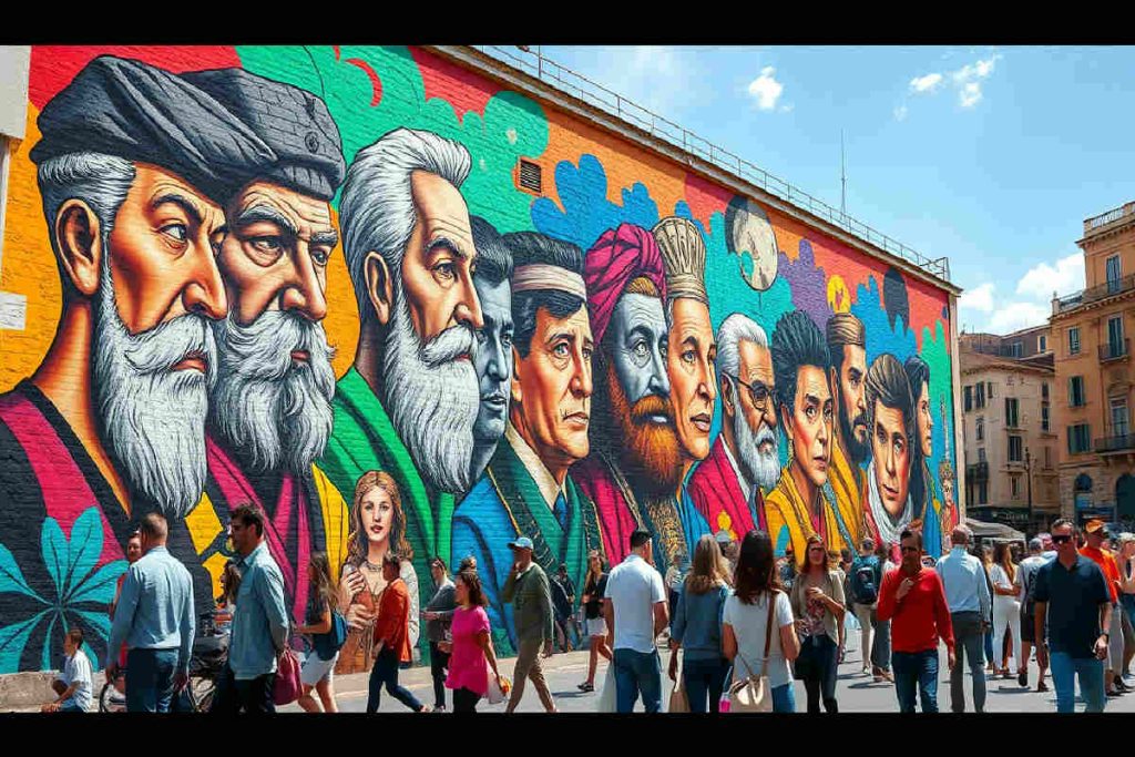 Nel cuore di Roma, uno dei focus è un grande murale alla Mostra d’Oltremare, noto spazio espositivo che ospita eventi culturali di rilievo. L’opera si estende su una vasta superficie, con figure simbolo della storia italiana e internazionale rivisitate in chiave moderna. Colori intensi e tecniche miste danno vita a un dialogo tra passato e presente. Qui, l’arte di strada non è semplice decorazione, ma memoria condivisa che invita a riflettere sulle identità collettive di Roma e dell’Italia.